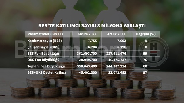 Emeklilik Gözetim Merkezi'nin (EGM) açıkladığı 8 Aralık 2022 verilerine göre katılımcı sayısının 7 milyon 829 bin olduğu BES’te toplam fon büyüklüğü 378.8 milyar lira oldu. Katılımcı sayısının 6 milyon 721 bin olduğu OKS’de ise fon büyüklüğü 30,7 milyar lira olarak kayıtlara geçti. BES’in toplam fon büyüklüğü OKS ve devlet katkısı dahil olmak üzere 409.5 milyar TL’ye, katılımcı sayısı da toplamda 14 milyon 550 bin kişiye ulaştı.
