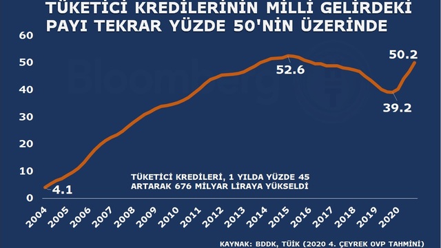 Tüketici kredilerinin milli gelir içindeki 2020'de hızlı arttı
