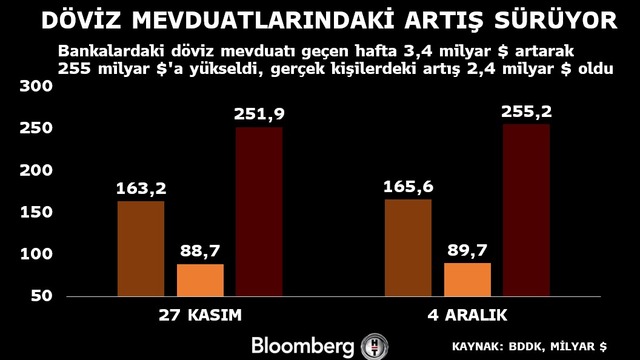 Bankalardaki döviz mevduatı artışı geçen hafta da devam etti. BDDK’nın günlük verilerine göre bankalardaki toplam döviz mevduatı 3,4 milyar dolar artarak 255 milyar dolara yükseldi. Artışın 2,4 milyar dolarlık kısmı gerçek kişilerden kaynaklandı.