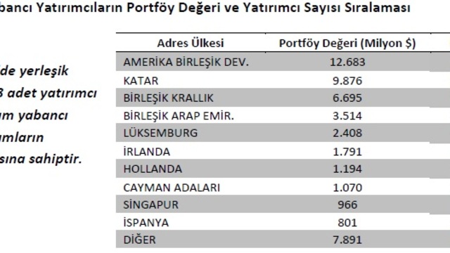 Rapora göre 2019 sonu itibarıyla Borsa İstanbul’da en yüksek portföy değerine sahip yabancı yatırımcılar sıralamasında ilk üç ülke ABD, Katar ve İngiltere oldu. Bir önceki yıl dördüncü sırada olan Katar ikinci sıraya yükseldi. ABD'nin payı yüzde 29'dan yüzde 26'ya gerilerken Katar'ın payı yüzde 7'den yüzde 20'ye yükseldi.