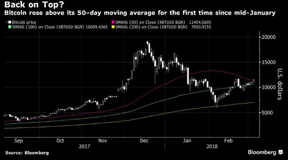 Piyasa değerine göre dünyanın en büyük kripto parası Bitcoin, Pazartesi günkü işlemlerde yaklaşık yüzde 5.8 yükselerek, Ocak ortasından bu yana ilk kez 50 günlük hareketli ortalamasının üzerine çıktı.