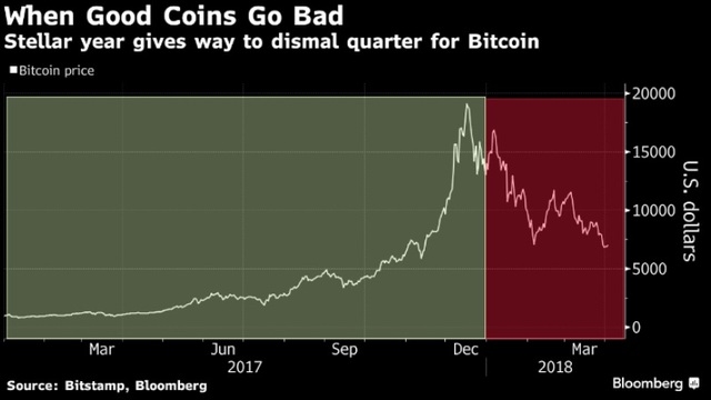Geçtiğimiz yıl yüzde 1,400 kazanç sağlayan kripto para, 2018'in ilk çeyreğinde yarısından fazla değer kaybetti. Bitstamp tarafından derlenen fiyat verisine göre bu, Bitcoin'in herhangi bir yıla yapmış olduğu en kötü başlangıç.