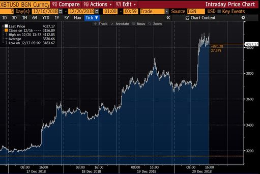 Perşembe günü TSİ 16:00'da yüzde 11 artıda 4,074.63 dolardan işlem gören Bitcoin'un bu haftaki toplam kazancı yaklaşık yüzde 28 oldu. Bitcoin, Aralık 2017'deki kripto para çılgınlığından bu yana görülen en iyi haftasını kaydetmeye yöneldi.