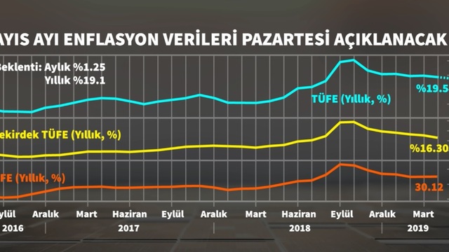 Pazartesi günü açıklanması beklenen Mayıs enflasyonunun aylık % 1.25; yıllık % 19.1 olması öngörülüyor