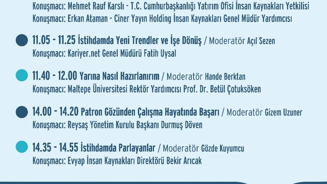 11:40'da Hande Berktan "Yarına Nasıl Hazırlanırım" başlıklı oturumda Maltepe Üniversitesi Rektör Yardımcısı Betül Çotukseven'i ağırlarken, oturumlar 14:00'da Gizem Uzuner moderatörlüğünde "Patron Gözünden Çalışma Hayatında Başarı" başlığı ile Reysaş Yönetim Kurulu Başkanı Durmuş Döven ile devam edecek.