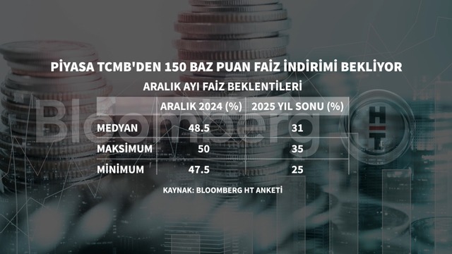 Bloomberg HT faiz anketine katılan 22 kurumun medyan beklentisi, Aralık ayında gerçekleşecek TCMB toplantısında faizi 150 baz puan indirimle yüzde 50’den yüzde 48,5 seviyesine düşürmesi yönünde.