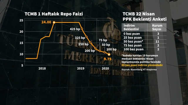 Ankete katılan 19 kurumun medyan tahmini politika faizinin 50 baz puan indirilerek yüzde 9.75'ten yüzde 9.25'e çekilmesi yönünde