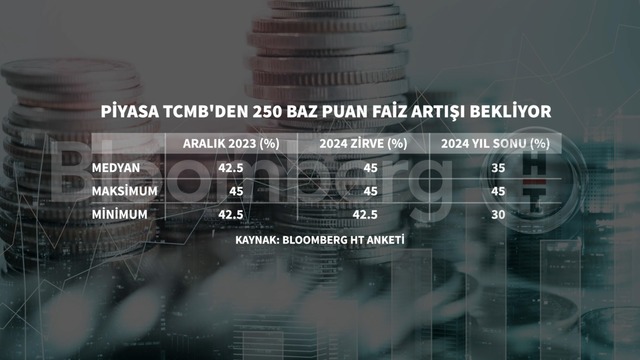 Bloomberg HT'nin anketine katılan 24 kurumun medyan beklentisi, Aralık ayında faizin 250 baz puan artarak yüzde 42,5 seviyesine çıkacağı yönünde oldu. Maksimum beklenti yüzde 45, minimum beklenti ise yüzde 42,5 oldu.