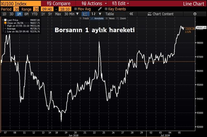 Güne pozitif başlayan Borsa İstanbul'da, genele yayılan alımlarla 99.264,80 puana kadar çıkan BIST 100 endeksi, 99.097 puanla 4 Haziran'dan bu yana en yüksek kapanışını gerçekleştirdi.