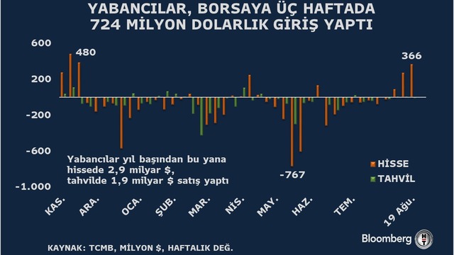 Türkiye Cumhuriyet Merkez Bankası (TCMB) verilerine göre, 19 Ağustos haftasında yabancı yatırımcıların net hisse alımı 366 milyon dolar oldu. Böylelikle 2021 Kasım ayından bu yana en yüklü yabancı girişi yaşandı.