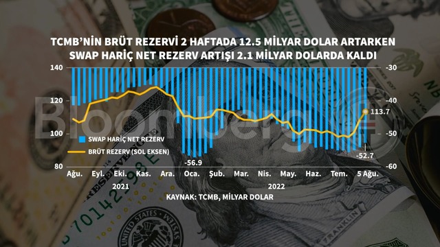 TCMB verilerine göre brüt rezervler 12 Ağustos haftasında 5,1 milyar dolar artışla 113,7 milyar dolara yükseldi. Böylelikle son iki haftada brüt rezervlerde 12,5 milyar dolarlık artış izlendi.