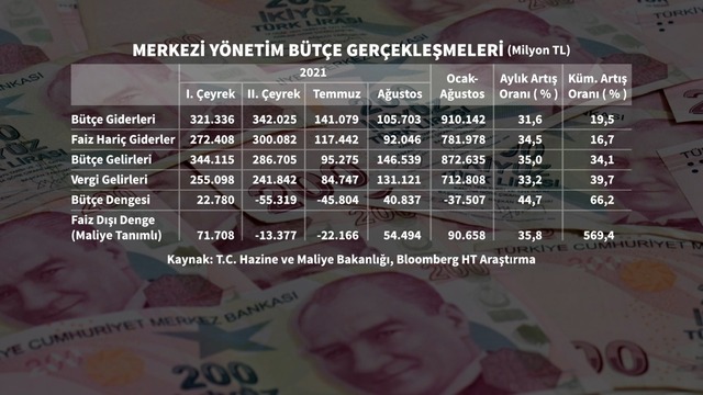 Yılın 8 aylık dönemi dikkate alındığında 2021 yılı Ocak-Ağustos döneminde merkezi yönetim bütçe giderleri 910,1 milyar TL, bütçe gelirleri 872,6 milyar TL ve bütçe açığı 37,5 milyar TL olarak gerçekleşti.