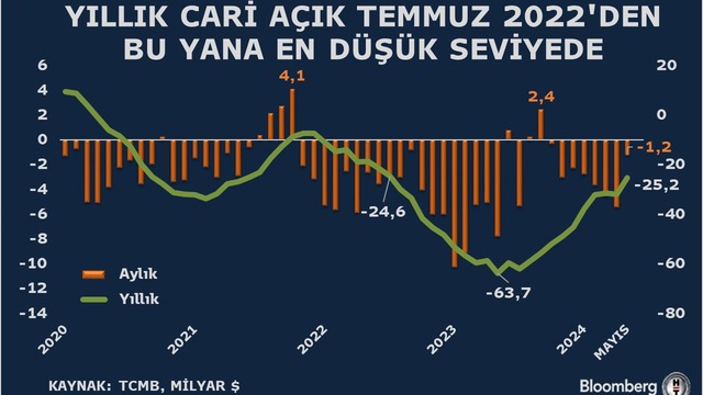 Mayıs ayı itibariyle 12 aylık cari açık 25,2 milyar dolar düzeyine geriledi. Bir önceki ay 12 aylık cari açık 31,7 milyar dolar olarak kaydedilmişti.