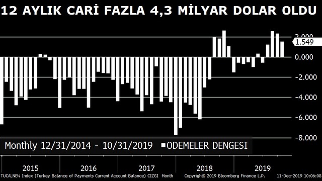 Türkiye'nin cari işlemler fazlası Ekim'de 1.55 milyar dolar fazla verdi. Bunun sonucunda, on iki aylık cari işlemler fazlası 4 milyar 336 milyon dolar oldu.