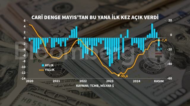 Türkiye Cumhuriyet Merkez Bankası (TCMB) verilerine göre, Kasım'da 12 aylık açık 7,4 milyar dolara yükseldi. Ekim ayında 12 aylık açık 7,1 milyar dolar düzeyindeydi. Yıllıklandırılmış verilere göre ödemeler dengesi tanımlı dış ticaret dengesi de 54,6 milyar dolar açık verdi.