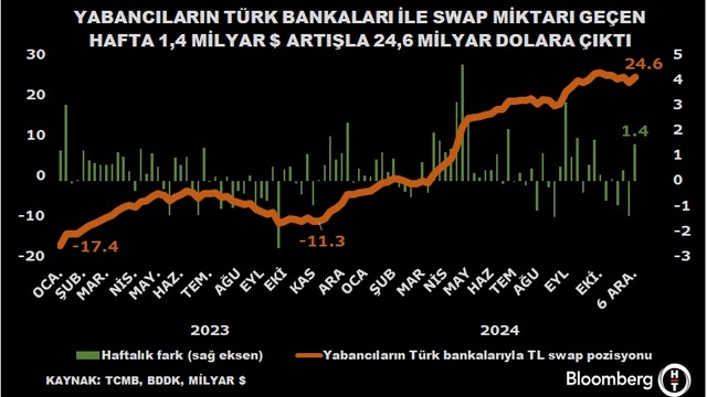 Bankacılık Düzenleme ve Denetleme Kurumu (BDDK) ve Türkiye Cumhuriyet Merkez Bankası (TCMB) verileri üzerinden yapılan hesaplamaya göre 6 Aralık haftasında carry trade tarafında 1,4 milyar dolarlık giriş görüldü.