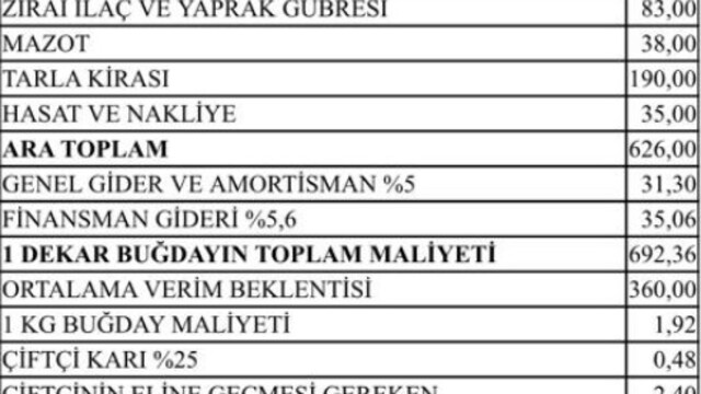 1 dekar buğday üretim maliyetinin 692 Lira 36 kuruş olarak hesaplandığı tabloda, dekar başına ortalama verim beklentisi de 360 kilogram olarak alındı.