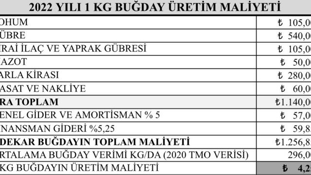 Mevcut girdi maliyetleri ile bir kilogram buğday üretmenin çiftçiye maliyetinin 4.25 TL'ye çıktığını belirten Doğru, "Bu girdi fiyatlarıyla buğday ekersek 1 kilogram buğdayın çiftçiye maliyeti 4.25 TL oluyor, hem de 1 kuruş kâr etmeden.. Geçen yıl gübrenin buğday maliyetindeki payı yüzde 29,6 iken şu an %43’ü geçiyor" dedi.