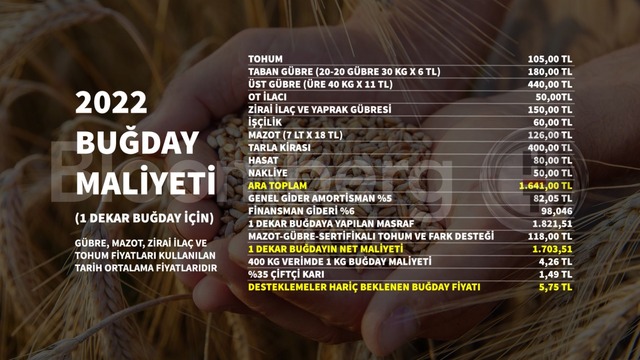 1 dekarda buğday net üretim maliyetinin 1.703,51 TL olarak hesaplandığı tabloda, dekar başına ortalama verim beklentisi de 400 kilogram olarak alındı.