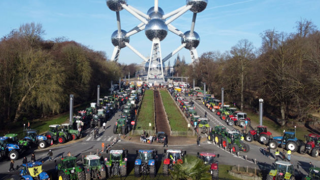 Atomium önündeki caddeyi çok sayıda traktörle trafiğe kapatan çiftçiler, AB ile Arjantin, Brezilya, Paraguay ve Uruguay'ı kapsayan MERCOSUR ülkeleri arasında dün imzalanan ticaret anlaşmasına tepki gösterdi.