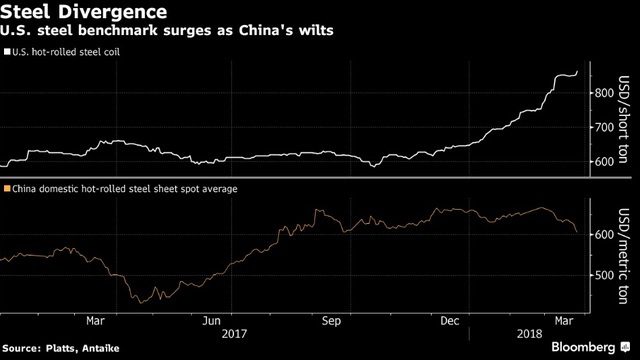 Bloomberg Intelligence kıdemli enerji ve madencilik hisse senedi analisti Andrew Cosgrove'a göre sıcak çekme gösterge Çin çeliğinin tonu 100 dolar civarında bulunuyor ve ABD'deki yerli sıcak çekme çeliğin fiyatının altında.