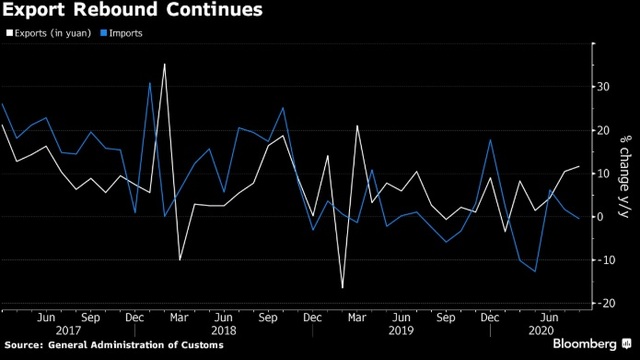 Çin'de ihracat Ağustos ayında ülkenin büyük ticari partnerlerinin kademeli olarak ekonomilerini açmaya başlamaları ile yükselirken, ithalatta beklenmedik bir gerileme yaşandı.