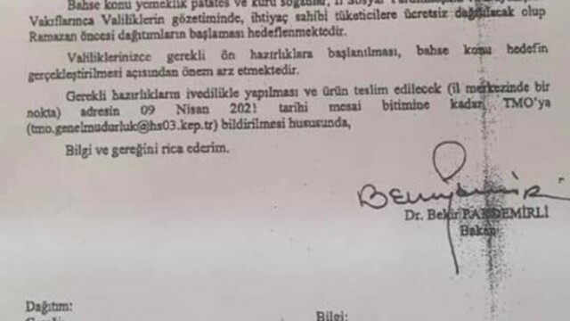 Konuyla ilgili olarak Tarım ve Orman Bakanı Bekir Pakdemirli imzasıyla 81 il valiliğine gönderilen yazıda, şu ifadelere yer verildi: "Üreticilerimizin elindeki arz fazlası yemeklik patates ve kuru soğanların Toprak Mahsulleri Ofisi (TMO) Genel Müdürlüğü tarafından alınması yönünde çalışmalara başlanmıştır. Bahse konu yemeklik patates ve kuru soğanlar, İl Sosyal Yardımlaşma ve Dayanışma Vakıflarınca Valiliklerin gözetiminde, ihtiyaç sahibi tüketicilere ücretsiz dağıtılacak olup Ramazan öncesi dağıtımların başlanması hedeflenmektedir. Valiliklerinizce gerekli ön hazırlıklara başlanılması, bahse konu hedefin gerçekleştirilmesi açısından önem arz etmektedir. Gerekli hazırlıkların ivedilikle yapılması ve ürün teslim wdilecek (il merkezinde bir nokta) adresin 09 Nisan 2021 tarihi mesai bitimine kadar TMO'ya bildirilmesi hususunda, bilgi ve gereğini arz ederim."