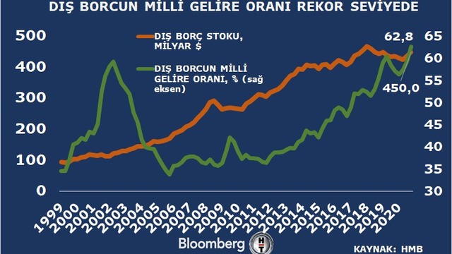 2020 sonu itibariyle Türkiye'nin dış borç stokunun milli gelire oranı tarihi yüksek seviyeye çıktı.