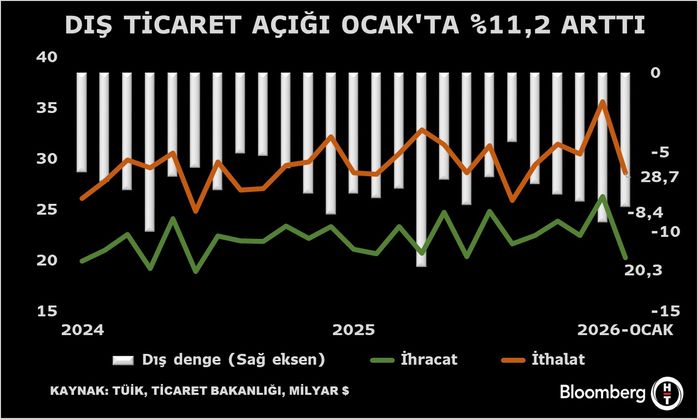 2026 yılında dış ticaret açığı, Ocak ayında geçen yılın aynı ayına göre yüzde 11,2 oranında artarak 8,4 milyar dolar olarak gerçekleşti.