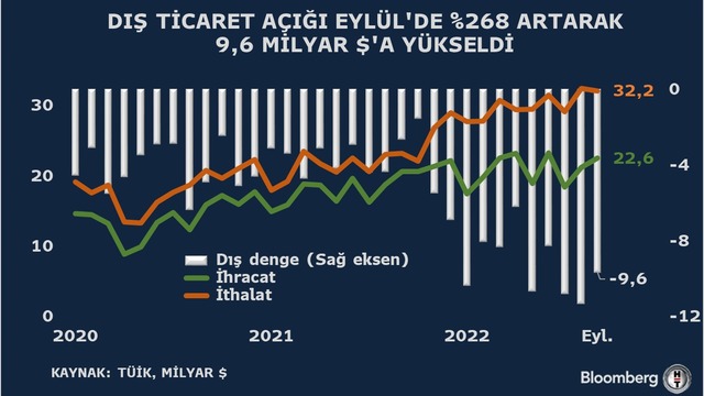 Türkiye İstatistik Kurumu'nun (TÜİK) Eylül ayına ilişkin dış ticaret verilerine göre, dış ticaret açığı bir önceki yılın aynı ayına göre yüzde 268,1 artarak 2,6 milyar dolardan 9,6 milyar dolara yükseldi. İhracat Eylül'de yıllık yüzde 9,2 artarak 22,6 milyar dolar, ithalat yüzde 38,1 artarak 32,2 milyar dolar olarak gerçekleşti.
