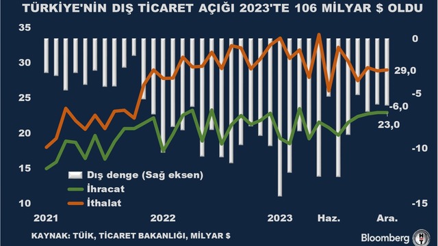 Türkiye İstatistik Kurumu ile Ticaret Bakanlığı iş birliğiyle genel ticaret sistemi kapsamında üretilen geçici dış ticaret verilerine göre; ihracat 2023 yılı Aralık ayında, bir önceki yılın aynı ayına göre yüzde 0,4 artarak 23 milyar dolar, ithalat yüzde 11,0 azalarak 29 milyar 39 milyon dolar olarak gerçekleşti.