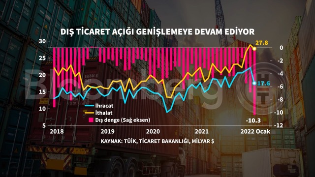 Ocak ayında dış ticaret açığı bir önceki yılın aynı ayına göre yüzde 234,9 artarak 3 milyar 64 milyon dolardan, 10 milyar 261 milyon dolara yükseldi. İhracatın ithalatı karşılama oranı 2021 Ocak ayında yüzde 83,0 iken, 2022 Ocak ayında yüzde 63,2'ye geriledi.