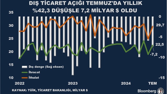 2023 Temmuz ayında dış ticaret açığı 12,5 milyar dolar iken, 2024 yılı Temmuz ayında 7,2 milyar dolara geriledi.