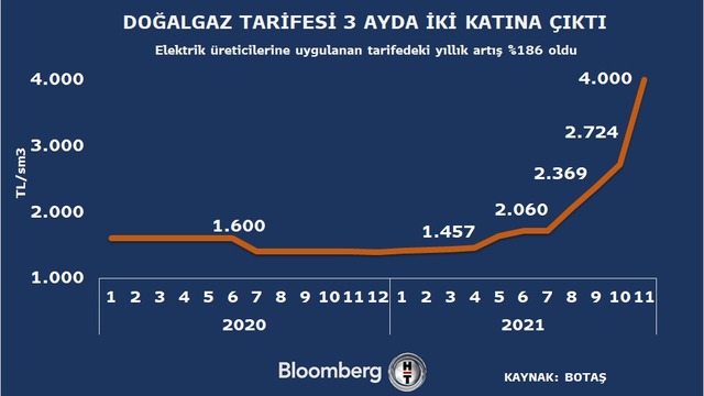 Kasım ayı sanayi aboneleri için geçerli olacak tarife ise önceki tarifeye göre bin metreküp doğalgaz için yüzde 48,4 artışla 3.500 lira, elektrik üretim santrallerinin kullandığı bin metreküp doğalgaz için ise yüzde 46,8 artışla 4.000 lira oldu.