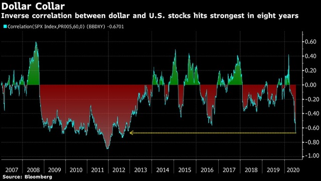 Bloomberg tarafından derlenen verilere göre Bloomberg Dolar Spot Endeksi (BBDXY) ile S&P 500 Endeksi arasındaki 60 günlük korelasyon 2012'den beri en düşük seviyeye geriledi.