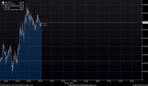 ABD Doları, 110.78 seviyesinden işlem görerek yen karşısında 1 Haziran'dan bu yana görülen en güçlü seviyesini kaydetti. Dolar, yen karşısısnda geçtiğimiz iki hafta içerisinde yüzde 7.3 tırmanarak 1988 yılından bu yana görülen en güçlü iki haftalık yükselişini kaydetti. Trump yönetiminin kamu harcamalarını artıracağı yönündeki spekülasyon ile hazine tahvillerinde görülen yükseliş, doların güçlenmesinde etkili oldu. Fed Başkanı Janet Yellen, Perşembe günkü konuşmasında merkez bankasının sıkılaştırma yolunda devam ettiğini belirtti.