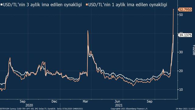 Dolar/TL’nin 1 aylık ima edilen oynaklığı 179 baz puan yükselişle yaklaşık yüzde 53’e çıktı. Türkiye’nin 5 yıllık CDS’i bir ara 492,7 baz puan seviyesine çıktı ve son bir yılın zirvesine ulaştı. Türkiye 10 yıllık tahvil getirisi günü 73 baz puan artışla iki yılın zirvesi olan 21,10’dan tamamladı.