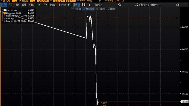 Geçen haftayı 4.6770'den kapatan kur uluslararası piyasada ilk tepki olarak sınırlı oranda düşerek saat 22:18'de 4.6573'e geriledi. Kur daha sonra düşüşünü hızlandırarak 4.59'a kadar geriledi. Euro da %1.7 kayıpla 5.35'te.