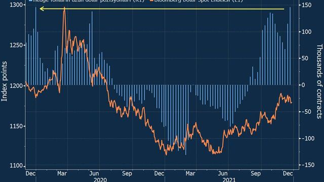 Hedge fonların diğer para birimlerine karşı uzun dolar pozisyonları Haziran 2019’tan bu yana en yüksek seviyeye ulaştı. Bloomberg Dolar Spot Endeksi bu yıl yüzde 5’e yakın yükseliş kaydederken Omikron varyantının ağır vakalara yol açmadığına dair çalışmalarla 1.192 seviyesinden 1.179’a kadar geriledi.