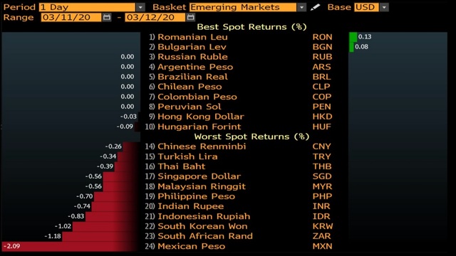 Dünya Sağlık Örgütü'nün koronavirüs salgınını pandemi olarak ilan etmesiyle diğer gelişen ülke para birimlerinde de değer kaybı görüldü. Bu sabah itibariyle dolara karşı en fazla değer kaybeden para birimleri Meksika pesosu, Güney Afrika randı ve Güney Kore wonu oldu.