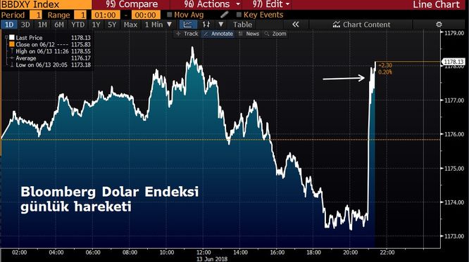 Bloomberg Dolar Endeksi gün içi işlemlere 1175.83 seviyesinden başlamasının ardından Fed sert yükseldi. Yüzde 0.20'den fazla yükseliş kaydederek 1178.84'e çıktı.