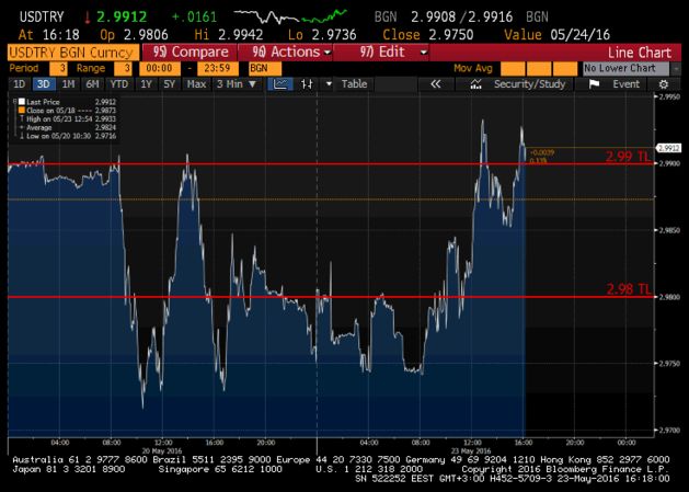 Haftanın ilk işlem gününe 2,9785 seviyelerinden başlayan dolar/TL 2.9737-2.9942 aralığında dalgalandı. Geçen hafta yayımlanan Fed toplantı tutanaklarının Haziran'da faiz artırımı beklentisini tetiklemesiyle 3'ün üzerini test eden dolar/TL, Cuma günü 2.97 seviyesinde dengelenmişti.