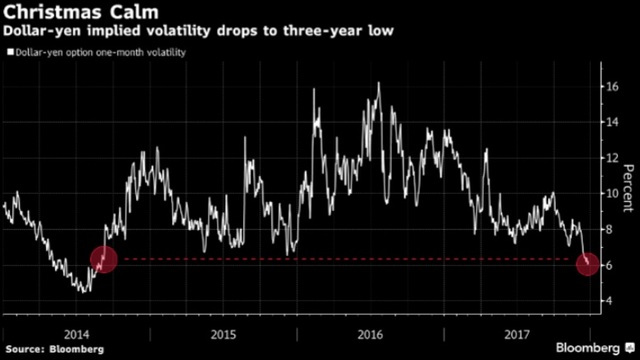 Dolar/yende beklenen volatilite, Noel tatilinin piyasalara getirdiği sakinlik ile üç yılın en düşük seviyesine indi