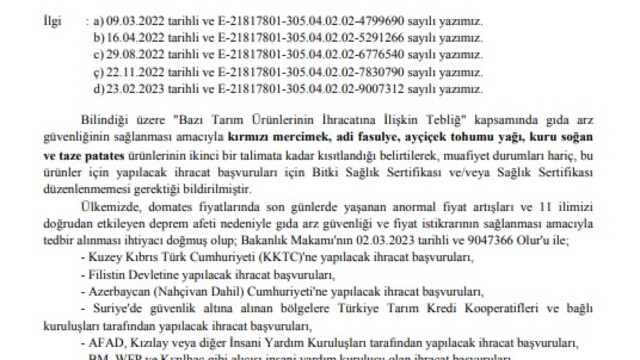 Tarım Bakanlığı tarafından 81 ile “ACELE” ibaresi ile gönderilen kısıtlama kararında, "Ülkemizde, domates fiyatlarında son günlerde yaşanan anormal fiyat artışları ve 11 ilimizi doğrudan etkileyen deprem afeti nedeniyle gıda arz güvenliği ve fiyat istikrarının sağlanması amacıyla tedbir alınması ihtiyacı doğmuş olup; Bakanlık Makamı'nın 02.03.2023 tarihli ve 9047366 Olur'u ile;