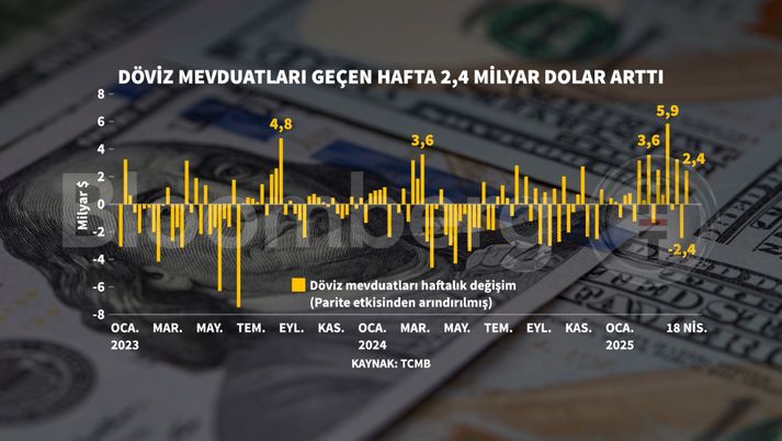 Türkiye Cumhuriyet Merkez Bankası (TCMB) verilerine göre, 18 Nisan haftasında döviz mevduatlarında parite etkisinden arındırılmış yükseliş 2,4 milyar dolar oldu.