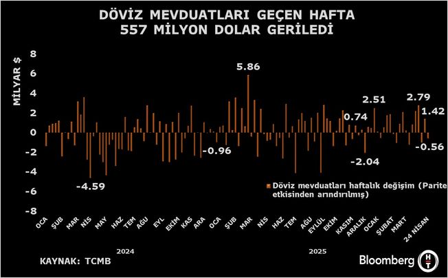 Türkiye Cumhuriyet Merkez Bankası (TCMB) verilerine göre yurt içi yerleşiklerin pariteden arındırılmış döviz mevduatları 24 Nisan haftasında 554 milyon dolar geriledi. Bir önceki hafta döviz mevduatlarında parite etkisinden arındırılmış verilere göre 1,4 milyar dolarlık düşüş izlenmişti.