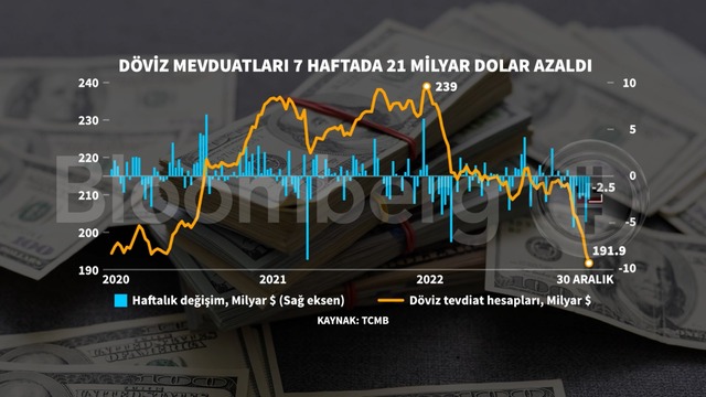Türkiye Cumhuriyet Merkez Bankası (TCMB) verilerine göre döviz mevduatları 30 Aralık haftası itibariyle 2,5 milyar dolar azalışla 191,9 milyar dolara geriledi.