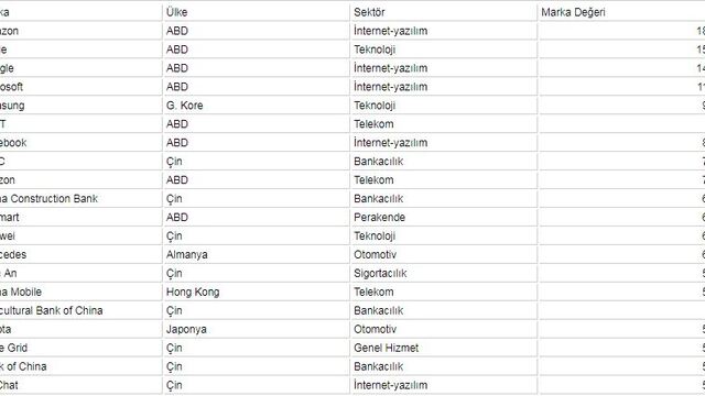 Sıralama tablosunun en altında yer alan markanın değeri 4,2 milyar doları bulurken, bu değere ulaşamadığı için Türk markaları sıralamada yer almadı.