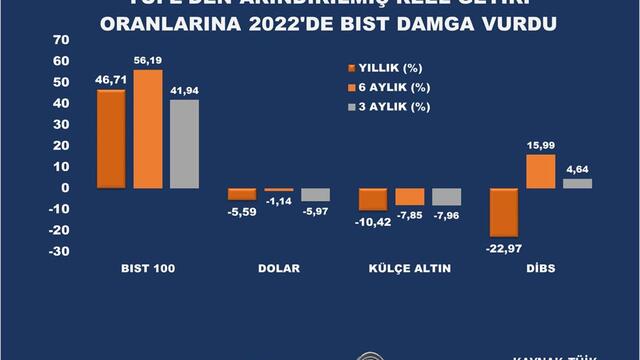 BIST 100 Endeksi, TÜİK’in “finansal yatırım araçlarının reel getiri oranları” Kasım sıralamasında TÜFE indirgenmiş olarak aylık yüzde 18,48 getiri ile açık ara pozitif tarafta yer alan yatırım aracı oldu. 3 aylık, 6 aylık ve 1 yıllık getirilere bakıldığında da; 2022’de hem dolar hem de TL bazında belirgin yükselen BIST 100 , reel getirilerde diğer alternatiflere fark atmaya devam etti. Endeks, TÜFE ile indirgendiğinde yüzde 46,71 oranında yatırımcısına en yüksek reel getiri sağlayan yatırım aracı oldu.