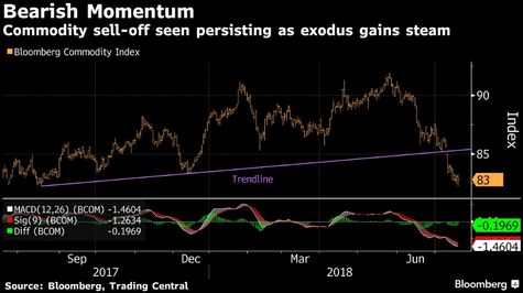 Bloomberg Emtia Emtia Endeksi, ticaret savaşının küresel büyümeyi rayında çıkarabileceği endişeleriyle, Mayıs ayında görülen zirvesinden yüzde 10 geriledi.